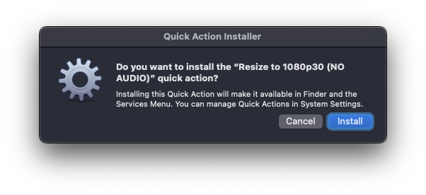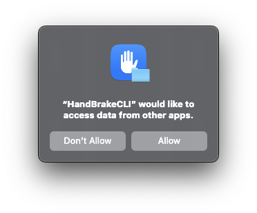 Once it is added right-click on the video in Finder to run the action and skip the creation steps below. You may need to allow the following if this is the first time using HandBrake CLI.