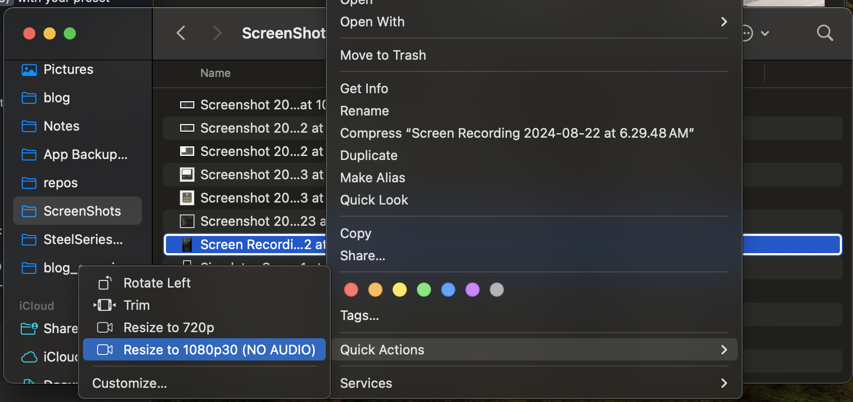 Feel free to cheat and download a previously created quick action built to work with a preset name1080p30 (NO AUDIO) and a folder name ~\Pictures\ScreenShots. Simply unzip and double click. download here