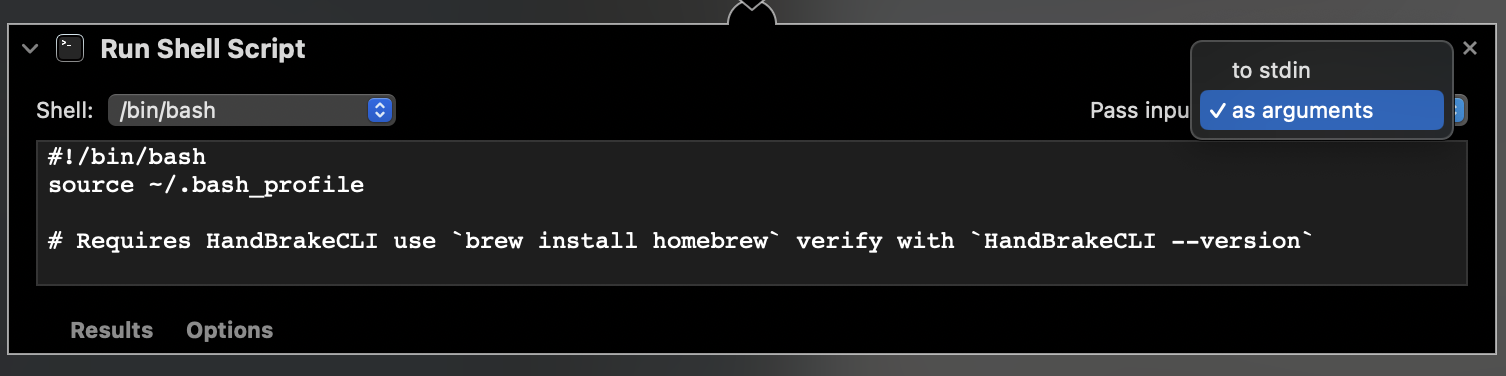 May 07, 2024 at 3:12PMWas finally able to finish a script to handle running HandBrake encodes. My use case is demo/functionality videos for merge requests. The key to making it work was updating the Automator action Pass input selection to As Arguments.