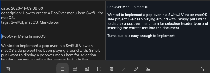 November 09, 2023 at 8:00AMWanted to implement a pop over in a SwiftUI View on macOS side project I've been playing around with. Simply put I want to display a popover menu item for selection header type and inserting the correct text into the document.